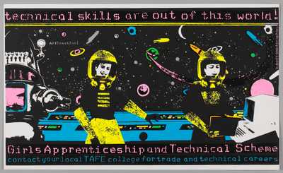Image: Kath Walters, ‘Technical skills are out of this world! Girls apprenticeship and technical scheme’ 1985, Screenprint on paper, Another Planet Posters, Melbourne, State Library Victoria