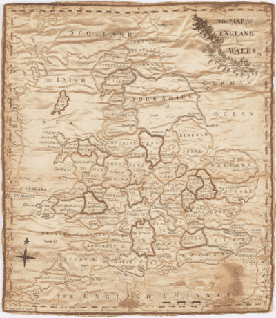 This embroidered map, or ‘sampler’, was made by Mary Redman in the 1780s. Maps became a popular motif in 18th century samplers, superseding pictorial designs and religious motifs.